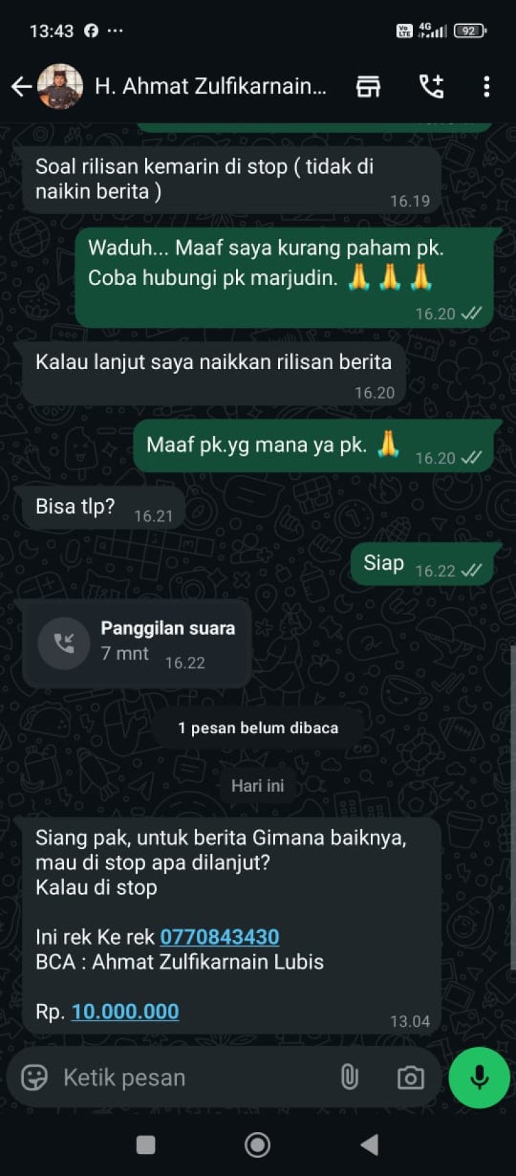 Ini malah yang bersangkutan menghubungi klien saya meminta uang sebesar Rp 10.000.000 rupiah dengan tujuan agar berita tidak berlanjut dan akan mentakedown berita sebelumnya yang telah tayang.