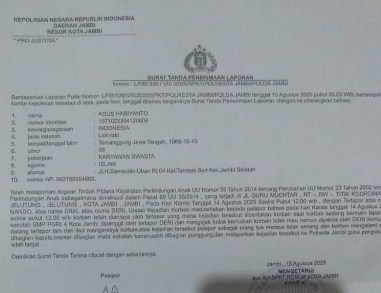 Orang tua korban, A (38), merasa tidak terima atas kejadian yang menimpa anaknya. Ia kemudian melaporkan peristiwa ini ke Polresta Jambi guna diproses secara hukum lebih lanjut.