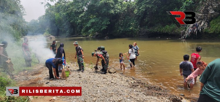 Kegiatan karya bakti pembersihan sampah organik dan nonorganik yang ada di bantaran aliran sungai Ciliwung dari sampah yang menumpuk serta menghambat laju air sungai Ciliwung oleh personel Babinsa bersama warga dan Anggota Denbekang.